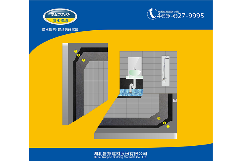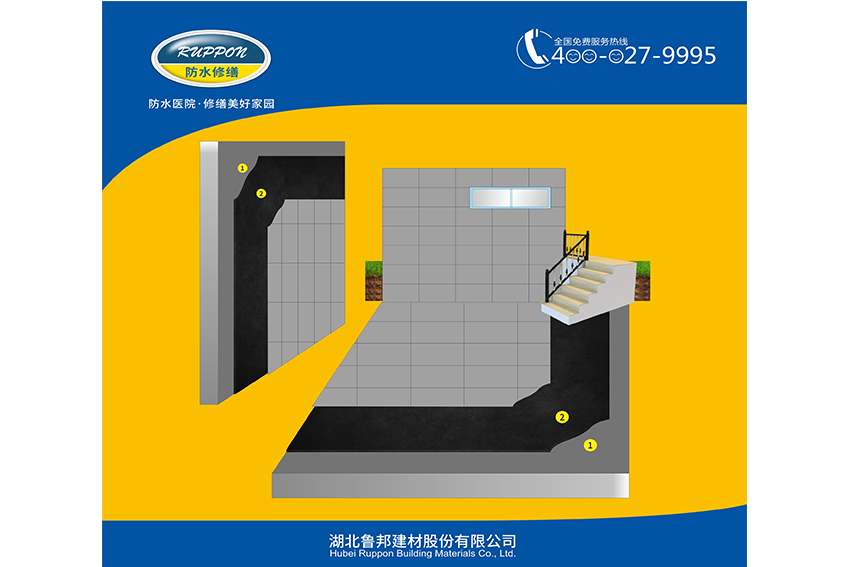 (5)保護(hù)、裝飾層:待涂膜完全干燥固化后,選擇與原內(nèi)墻相同或相近的材料與色澤,用魯邦Ruppon防水修復(fù)專(zhuān)用砂漿作粘結(jié)層,補(bǔ)修裝飾面層。