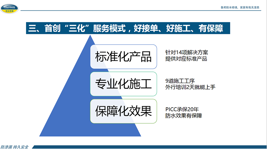 中國物業(yè)管理協(xié)會,在協(xié)助政府制定行業(yè)改革方案、發(fā)展規(guī)劃、產(chǎn)業(yè)政策等方面發(fā)揮重要作用并設有物業(yè)維修資金研究專業(yè)委員會。湖北魯邦建材股份有限公司在全國率先成立魯邦防水修繕服務中心,緊緊圍繞老城區(qū)、老小區(qū)作房屋防水修繕服務,切實的為廣大居民解決生活煩惱且協(xié)助物業(yè)公司與居民構(gòu)建了和諧關(guān)系。探索出了一套具有魯邦特色、可持續(xù)發(fā)展的商業(yè)模式,得到物業(yè)行業(yè)的認可。幾年來,全國多地知名物業(yè)企業(yè)紛紛前來考察交流,提升了魯邦防水修繕服務中心行業(yè)對外形象。魯邦防水修繕服務中心在全國舊房防水修繕市場環(huán)境下成長為知名品牌企業(yè),建立了“三化”服務模式對行業(yè)更具有起到了帶好頭的榜樣。